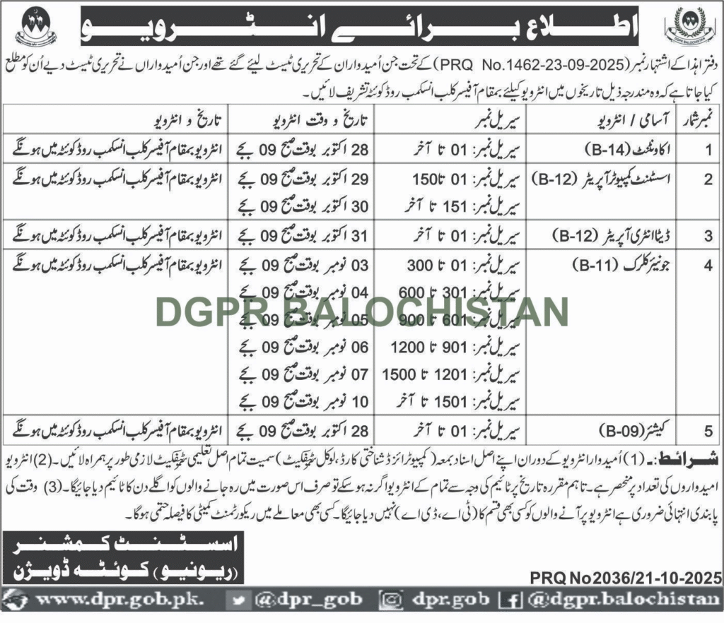 Interview Notice – Revenue Department Balochistan, Quetta Division