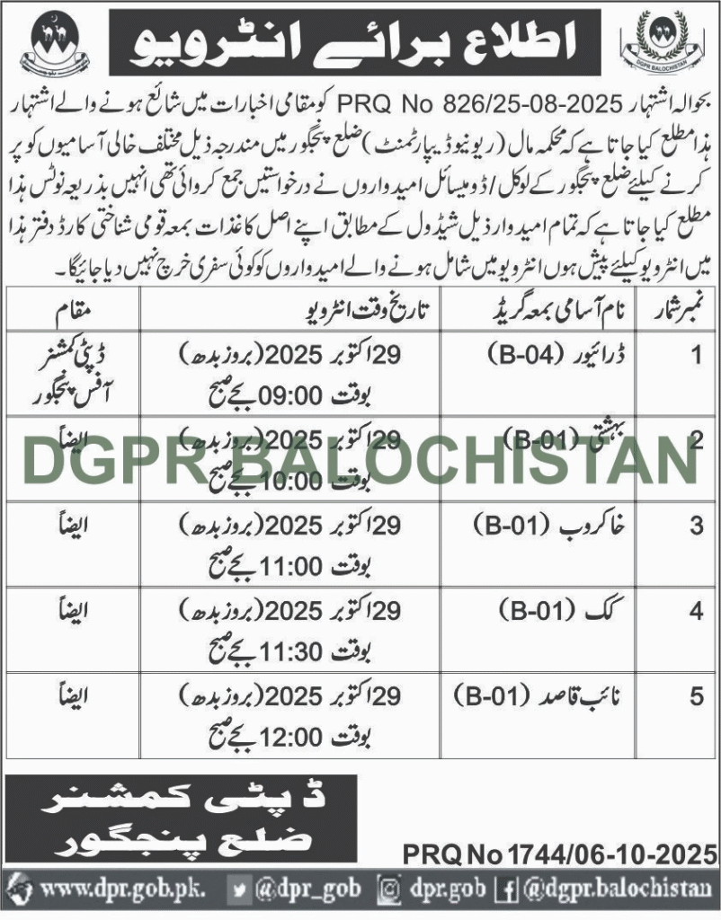 Interview Notice: Scheduled Interviews for Vacant Posts in Revenue Department, District Panjgur