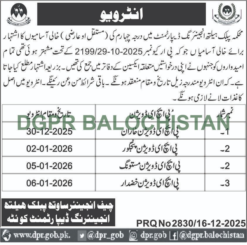 Interview Notification for Class IV Temporary and Permanent Positions – Public Health Engineering Department (South), Office of the Chief Engineer
