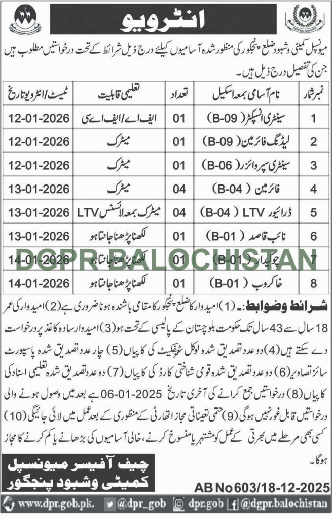 Adv-JobsInterview Notification for Various Vacant Positions – Municipal Committee Washbod, District PanjgurDecember 19, 2025December 19, 2025Comments (0)Shams Ur Rehman Anas Hussain