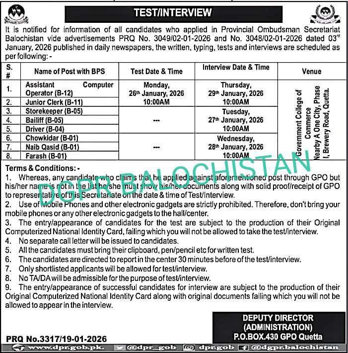 Adv-JobsInterview Notification: Written Test & Interview Schedule for BPS-01 to BPS-12 Posts (Provincial Ombudsman Secretariat Balochistan)January 20, 2026January 20, 2026Comments (0)Shams Ur Rehman Anas Hussain