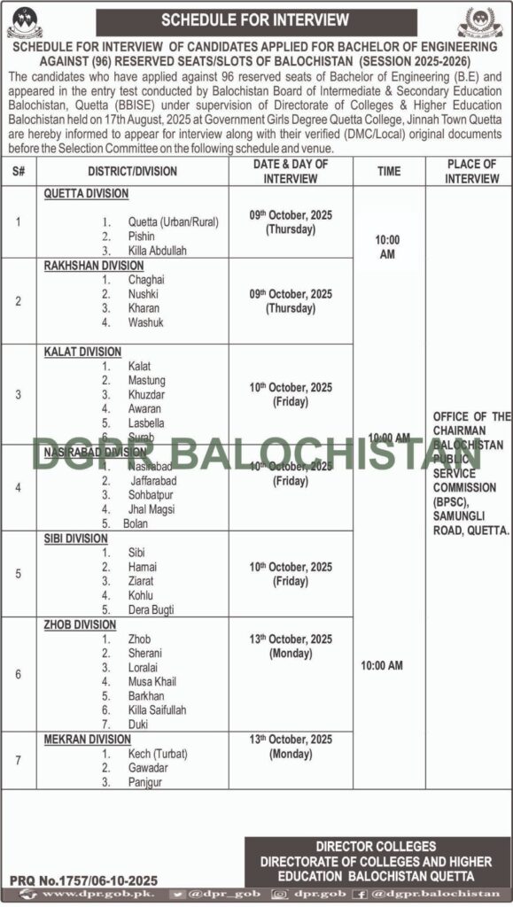 Interview Schedule Announced for Reserved Seats in Bachelor of Engineering