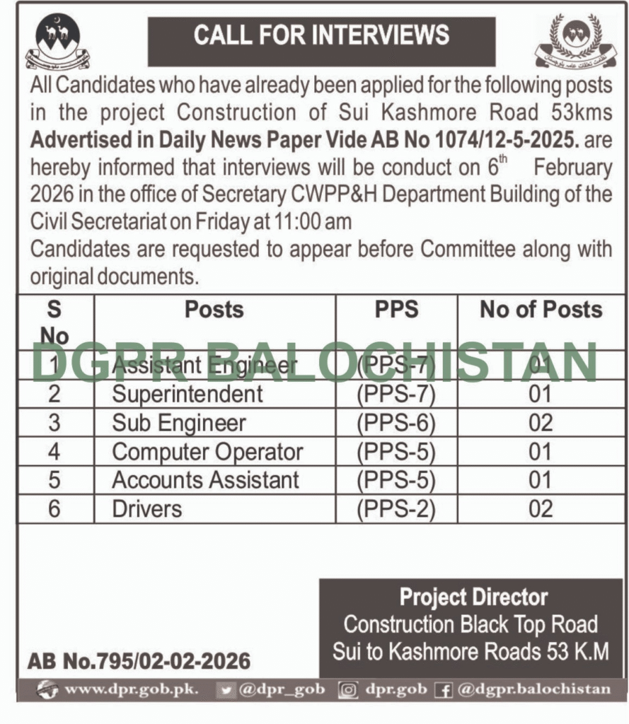 Adv-JobsInterview Schedule Announcement for Sui–Kachhi Mor Road Project Vacancies (CWPP&H Department)February 4, 2026February 4, 2026Comments (0)Shams Ur Rehman Anas Hussain