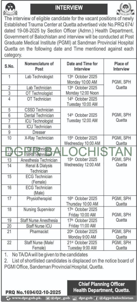 Interview Schedule Announcement – Trauma Center, Sandeman Provincial Hospital Quetta (Health Department Balochistan)