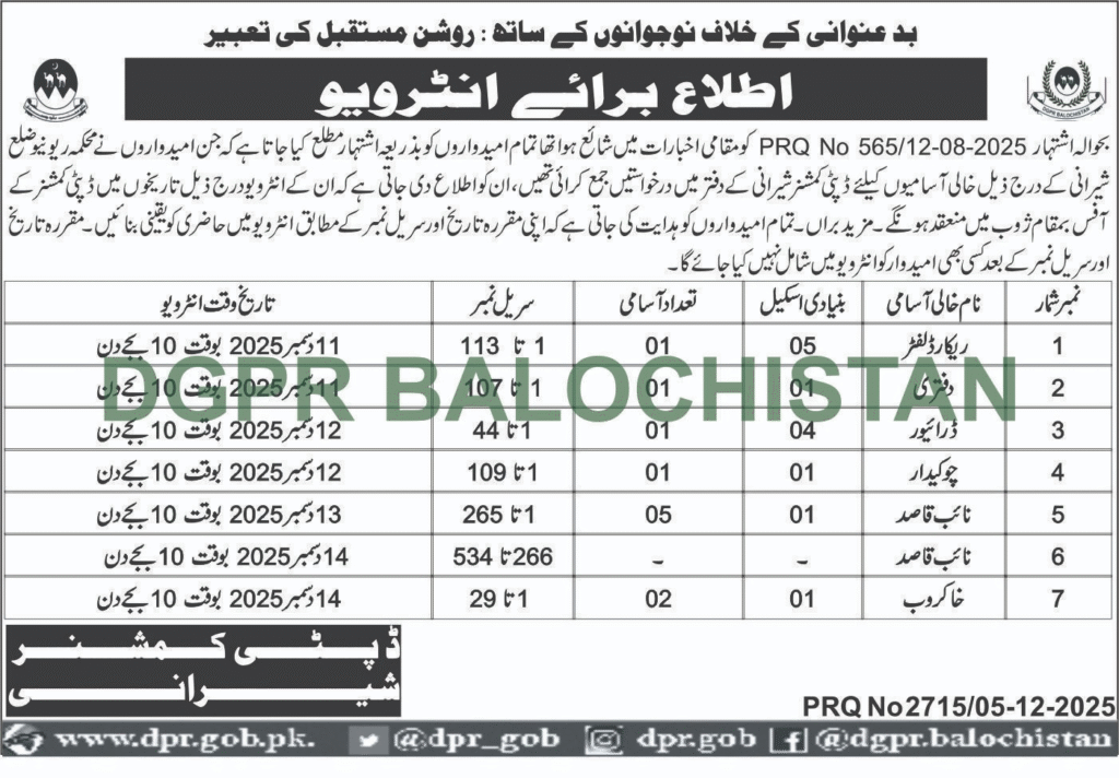 Adv-JobsInterview Schedule Notice – Revenue Department, Sherani District (Class IV Vacancies)December 6, 2025December 6, 2025Comments (0)Shams Ur Rehman Anas Hussain