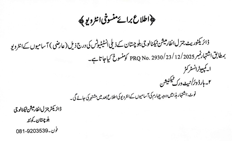 Adv-JobsInterviews for Advertised Temporary Positions at the Directorate General of Information Technology Balochistan CancelledJanuary 26, 2026January 26, 2026Comments (0)Shams Ur Rehman Anas Hussain