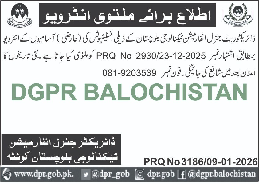 Adv-JobsInterviews for Temporary Positions at Subordinate Institutes of Directorate General of Information Technology Balochistan PostponedJanuary 9, 2026January 9, 2026Comments (0)Shams Ur Rehman Anas Hussain