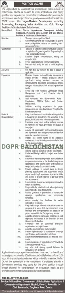 Job Opportunity — Project Director (Contract Basis) in Agriculture Department Balochistan