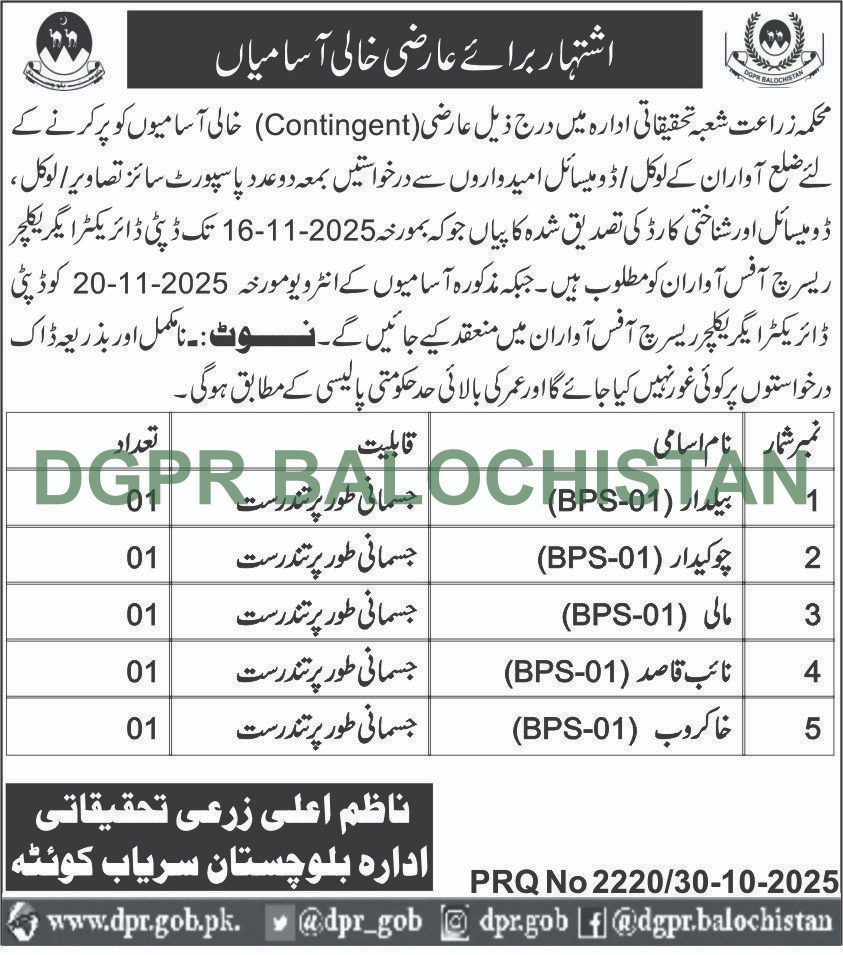Job Vacancies – Agricultural Research Department Balochistan (District Awaran)