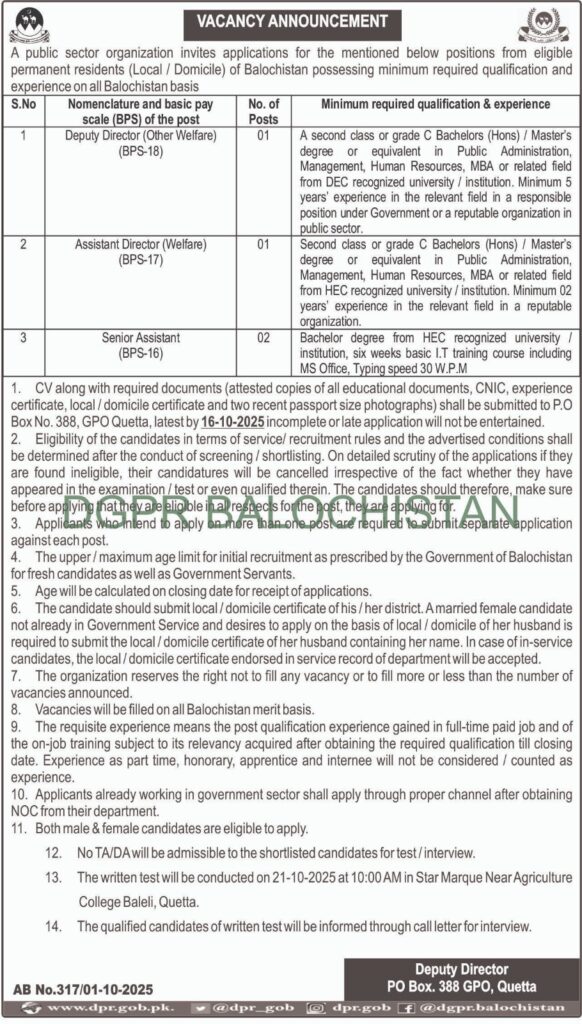 Job Vacancies Announcement (BPS-16 to BPS-18) – Public Sector Organization Balochistan