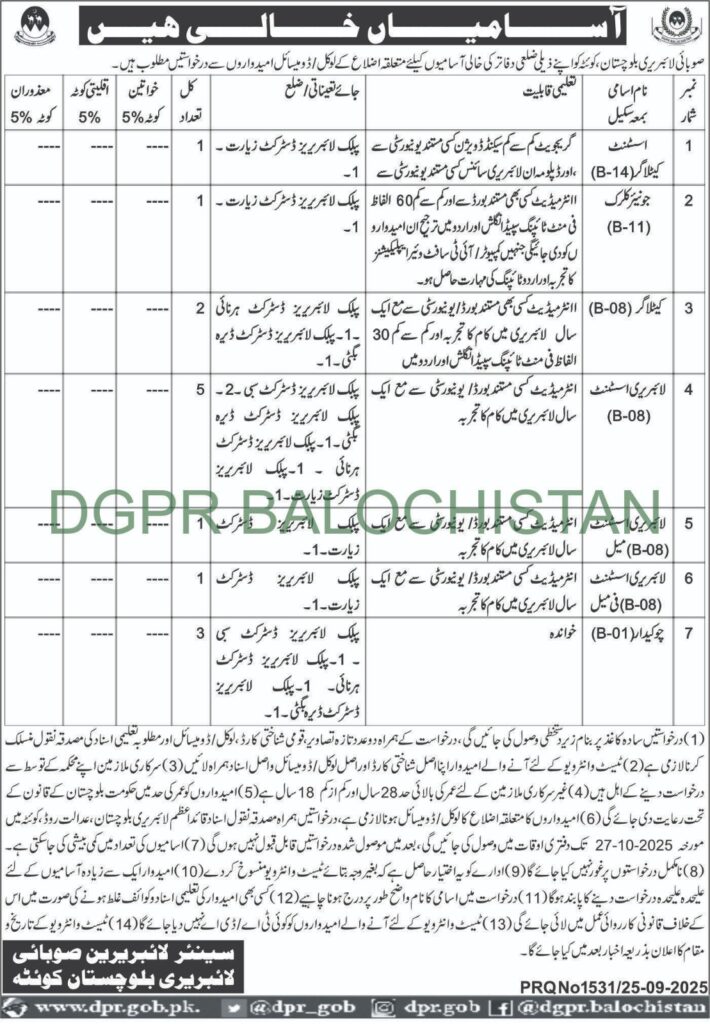 Job Vacancies – Provincial Library Balochistan (BPS-01 to BPS-14)