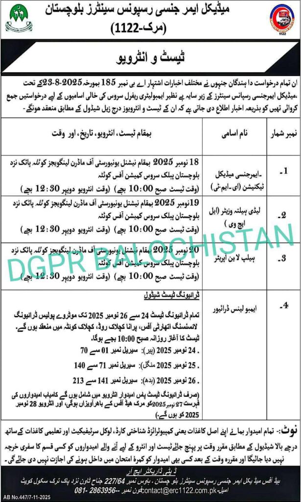 Medical Emergency Response Center Balochistan – Test and Interview Announcement