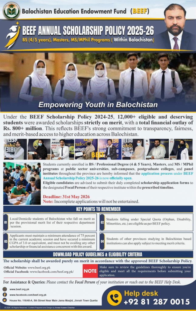 Adv-JobsScholarship Program: BEEF Announces New 2025–26 Scholarship Policy Schedule for Students of BalochistanApril 3, 2026April 3, 2026Comments (0)Shams Ur Rehman Anas Hussain