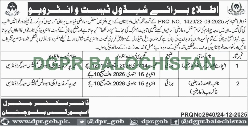 Sports Department Balochistan – Notice for Test and Interview (District Harnai)