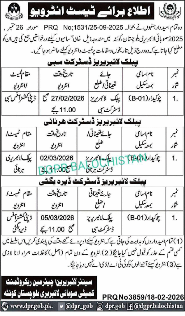 Test and Interview Schedule Announcement – Provincial Library Balochistan
