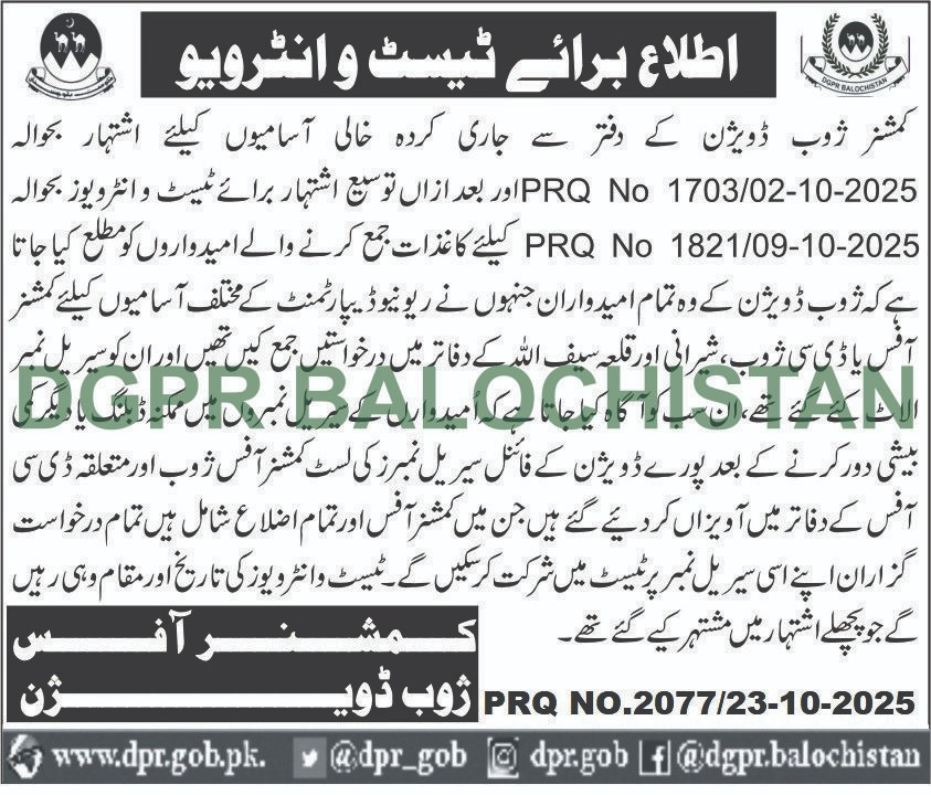 Test and Interview Schedule Released – Commissioner Zhob Division (Revenue Department Vacancies)