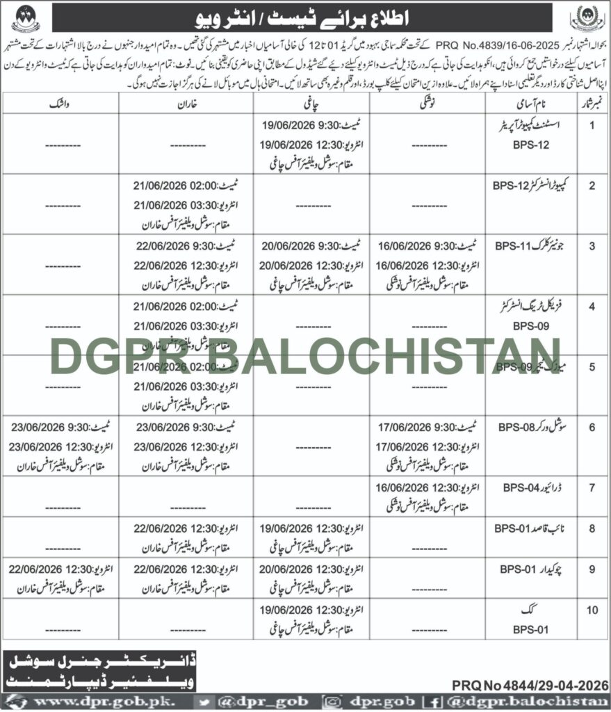 Test & Interview Notification for Vacant Positions in the Social Welfare Department