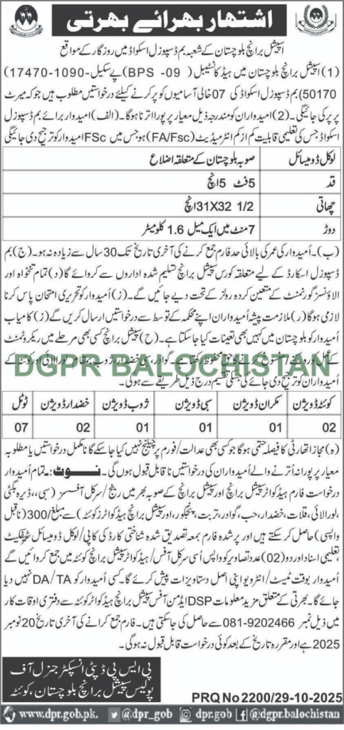 Vacancy Announcement – Head Constable (BPS-09), Special Branch Balochistan