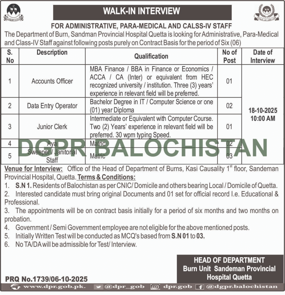 Walk-in Interviews: Vacant Posts in Burn Department, Sandeman Provincial Hospital Quetta